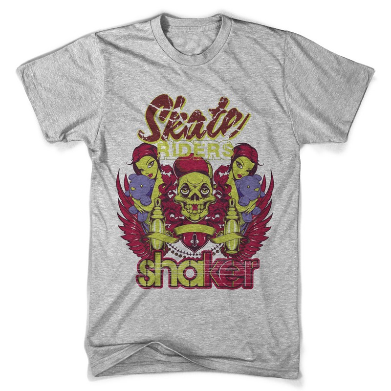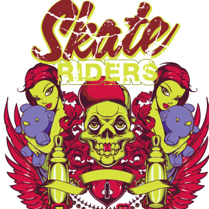 Skate shaker graphic design template in vector format, featuring detailed badass boy skull and two sexy girls now available for Adobe Illustrator, Adobe Photoshop and Corel Draw and can be used for digital printing and screenprinting .