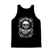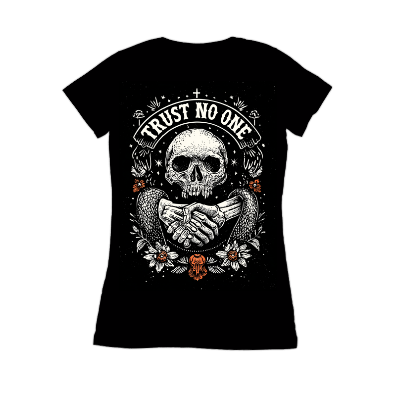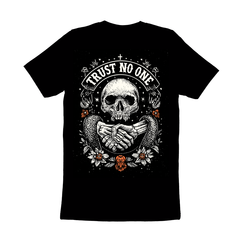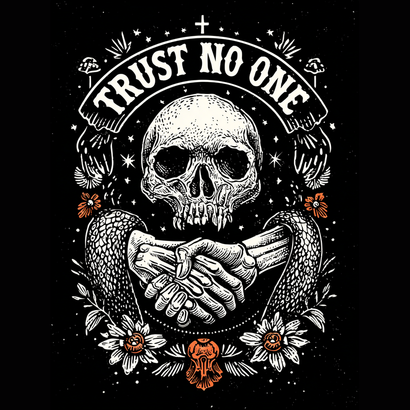 This striking design features a detailed skull at its center, framed by the cautionary words "TRUST NO ONE" in a bold, curved banner. Below the skull, a handshake takes place between a skeletal hand and a human hand, symbolizing a pact or agreement with potentially dire consequences. The artwork is further embellished with floral elements, mushrooms, and scattered stars, adding a touch of macabre beauty to the overall composition. The color palette is primarily black and white, with subtle hints of orange in the floral details, enhancing the design's visual impact. The style evokes vintage tattoo art and dark illustration, making it a compelling and thought-provoking piece.