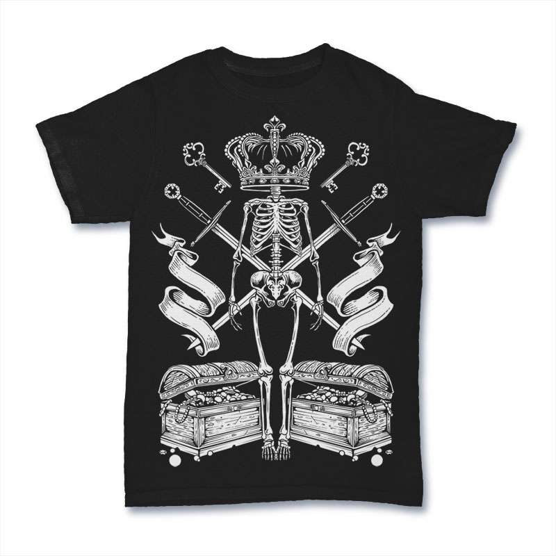 Skeleton King artwork concept for T-shirt design with 1 print colors and the delivered file is PSD separated Layers and PNG Image File. This artwork Can be used for digital printing and screen printing. Enjoy