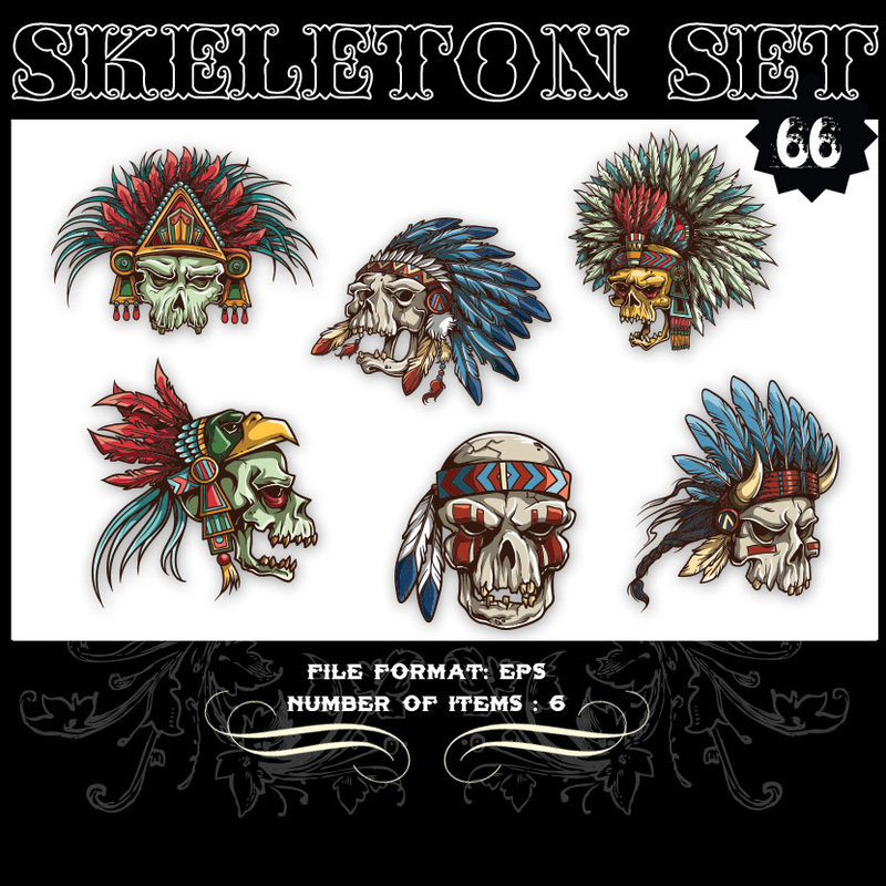 Skeleton set 66 - vector set including skull designs with different types of headdresses, with warrior expressions and paint. The file will be available AI and EPS formats.