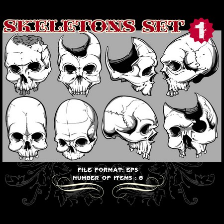 Skeletons Sets are one of our favorite vectors, bound to make an impression on you. The skull is a symbolic reminder that we are all mortal and we should live our life to the fullest accepting our fate with dignity. Often combined with a variety of other design elements such as wings, crosses, ribbons or flames, these designs are here to guide you towards innovative ways.