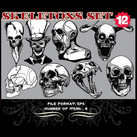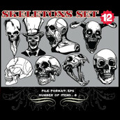 Skeletons Sets are some of our favorite vectors, bound to make an impression on you. The skull is a symbolic reminder that we are all mortal and we should live our life to the fullest accepting our fate with dignity. Often combined with a variety of other design elements such as wings, crosses, ribbons or flames, these designs are here to guide you towards innovative ways.