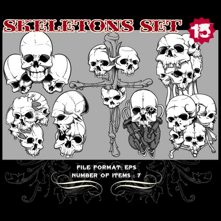 Skeletons Sets are some of our favorite vectors, bound to make an impression on you. The skull is a symbolic reminder that we are all mortal and we should live our life to the fullest accepting our fate with dignity. Often combined with a variety of other design elements such as wings, crosses, ribbons or flames, these designs are here to guide you towards innovative ways.