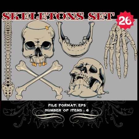 Skeletons Sets are some of our favorite vectors, bound to make an impression on you. The skull is a symbolic reminder that we are all mortal and we should live our life to the fullest accepting our fate with dignity. Often combined with a variety of other design elements such as wings, crosses, ribbons or flames, these designs are here to guide you towards innovative ways.