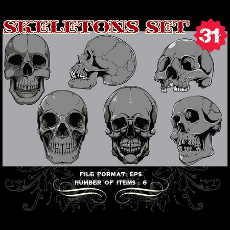 Skeletons Sets are some of our favorite vectors, bound to make an impression on you. The skull is a symbolic reminder that we are all mortal and we should live our life to the fullest accepting our fate with dignity. Often combined with a variety of other design elements such as wings, crosses, ribbons or flames, these designs are here to guide you towards innovative ways.