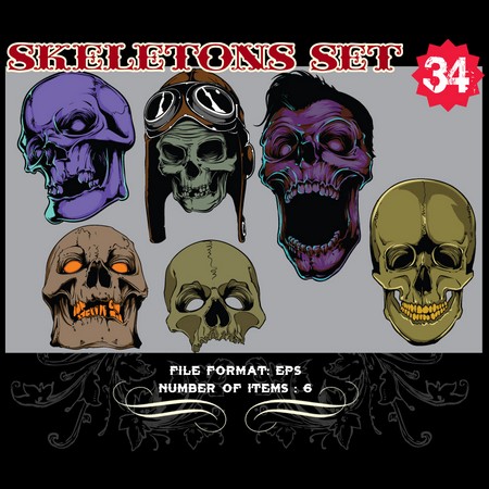 Skeletons Sets are some of our favorite vectors, bound to make an impression on you. The skull is a symbolic reminder that we are all mortal and we should live our life to the fullest accepting our fate with dignity. Often combined with a variety of other design elements such as wings, crosses, ribbons or flames, these designs are here to guide you towards innovative ways.