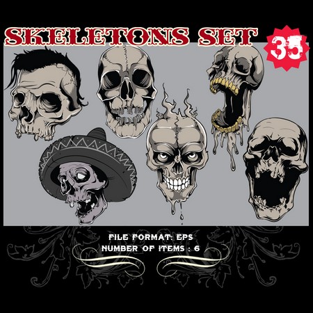 Skeletons Sets are some of our favorite vectors, bound to make an impression on you. The skull is a symbolic reminder that we are all mortal and we should live our life to the fullest accepting our fate with dignity. Often combined with a variety of other design elements such as wings, crosses, ribbons or flames, these designs are here to guide you towards innovative ways.