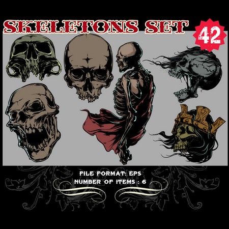 Skeletons Sets are some of our favorite vectors, bound to make an impression on you. The skull is a symbolic reminder that we are all mortal and we should live our life to the fullest accepting our fate with dignity. Often combined with a variety of other design elements such as wings, crosses, ribbons or flames, these designs are here to guide you towards innovative ways.
