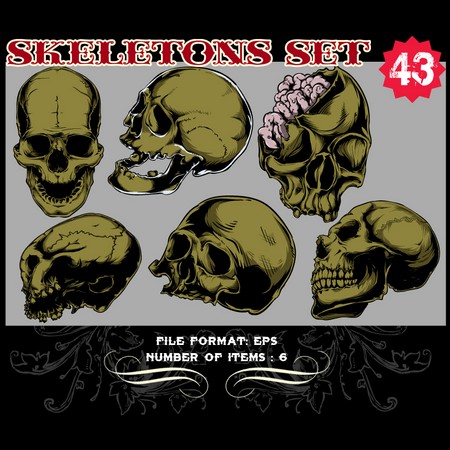 Skeletons Sets are some of our favorite vectors, bound to make an impression on you. The skull is a symbolic reminder that we are all mortal and we should live our life to the fullest accepting our fate with dignity. Often combined with a variety of other design elements such as wings, crosses, ribbons or flames, these designs are here to guide you towards innovative ways.