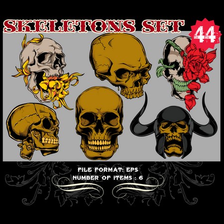 Skeletons Sets are some of our favorite vectors, bound to make an impression on you. The skull is a symbolic reminder that we are all mortal and we should live our life to the fullest accepting our fate with dignity. Often combined with a variety of other design elements such as wings, crosses, ribbons or flames, these designs are here to guide you towards innovative ways.