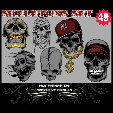 Skeletons Sets are some of our favorite vectors, bound to make an impression on you. The skull is a symbolic reminder that we are all mortal and we should live our life to the fullest accepting our fate with dignity. Often combined with a variety of other design elements such as wings, crosses, ribbons or flames, these designs are here to guide you towards innovative ways.
