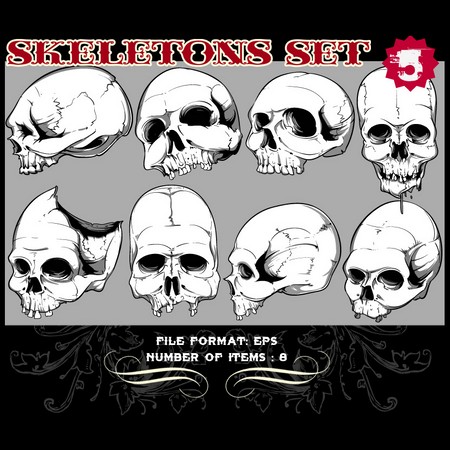 Skeletons Sets are some of our favorite vectors, bound to make an impression on you. The skull is a symbolic reminder that we are all mortal and we should live our life to the fullest accepting our fate with dignity. Often combined with a variety of other design elements such as wings, crosses, ribbons or flames, these designs are here to guide you towards innovative ways.