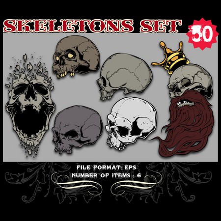 Skeletons Sets are some of our favorite vectors, bound to make an impression on you. The skull is a symbolic reminder that we are all mortal and we should live our life to the fullest accepting our fate with dignity. Often combined with a variety of other design elements such as wings, crosses, ribbons or flames, these designs are here to guide you towards innovative ways.