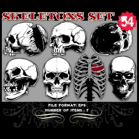Skeletons Sets are some of our favorite vectors, bound to make an impression on you. The skull is a symbolic reminder that we are all mortal and we should live our life to the fullest accepting our fate with dignity. Often combined with a variety of other design elements such as wings, crosses, ribbons or flames, these designs are here to guide you towards innovative ways.