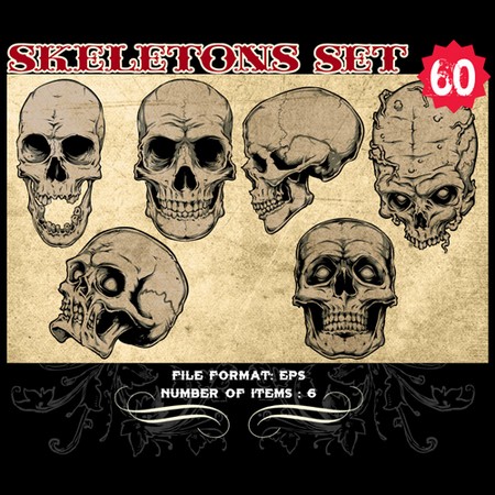 Skeletons Sets are some of our favorite vectors, bound to make an impression on you. The skull is a symbolic reminder that we are all mortal and we should live our life to the fullest accepting our fate with dignity. Often combined with a variety of other design elements such as wings, crosses, ribbons or flames, these designs are here to guide you towards innovative ways.