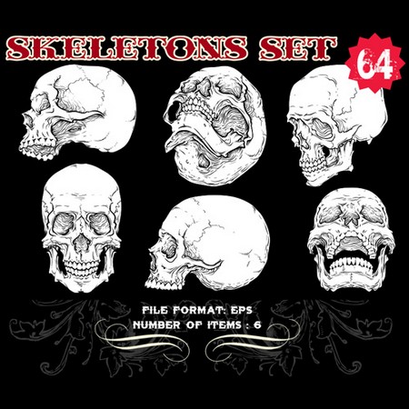 Skeletons Sets are some of our favorite vectors, bound to make an impression on you. The skull is a symbolic reminder that we are all mortal and we should live our life to the fullest accepting our fate with dignity. Often combined with a variety of other design elements such as wings, crosses, ribbons or flames, these designs are here to guide you towards innovative ways.