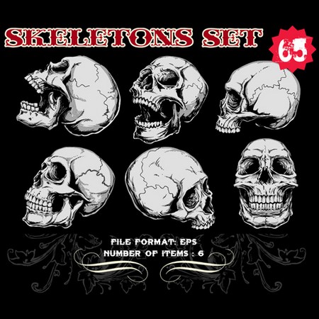 Skeletons Sets are some of our favorite vectors, bound to make an impression on you. The skull is a symbolic reminder that we are all mortal and we should live our life to the fullest accepting our fate with dignity. Often combined with a variety of other design elements such as wings, crosses, ribbons or flames, these designs are here to guide you towards innovative ways.