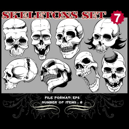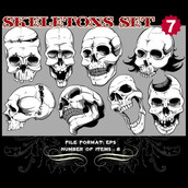 Skeletons Sets are some of our favorite vectors, bound to make an impression on you. The skull is a symbolic reminder that we are all mortal and we should live our life to the fullest accepting our fate with dignity. Often combined with a variety of other design elements such as wings, crosses, ribbons or flames, these designs are here to guide you towards innovative ways.