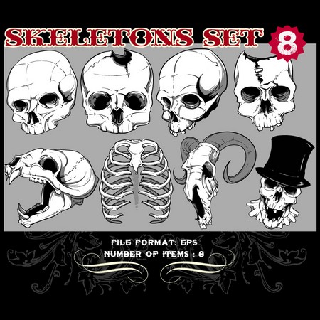 Skeletons Sets are some of our favorite vectors, bound to make an impression on you. The skull is a symbolic reminder that we are all mortal and we should live our life to the fullest accepting our fate with dignity. Often combined with a variety of other design elements such as wings, crosses, ribbons or flames, these designs are here to guide you towards innovative ways.