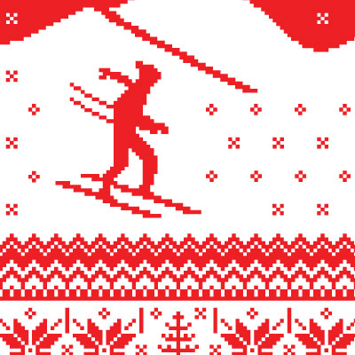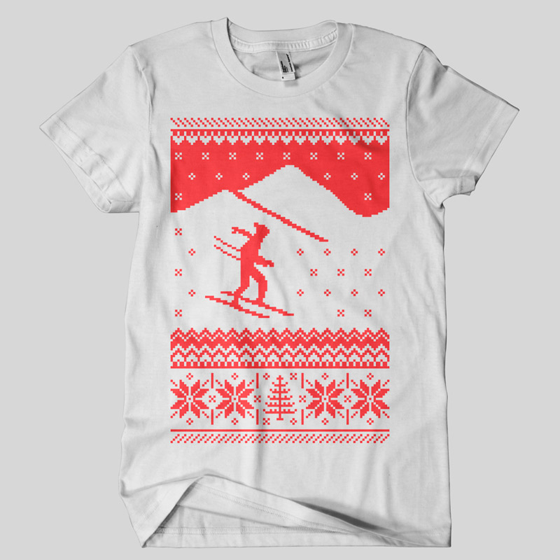 Ski Trip t-shirt design featuring traditional winter holiday patterns, that imitates the texture of knitted pullovers. The template can be used for digital printing and screenprinting.