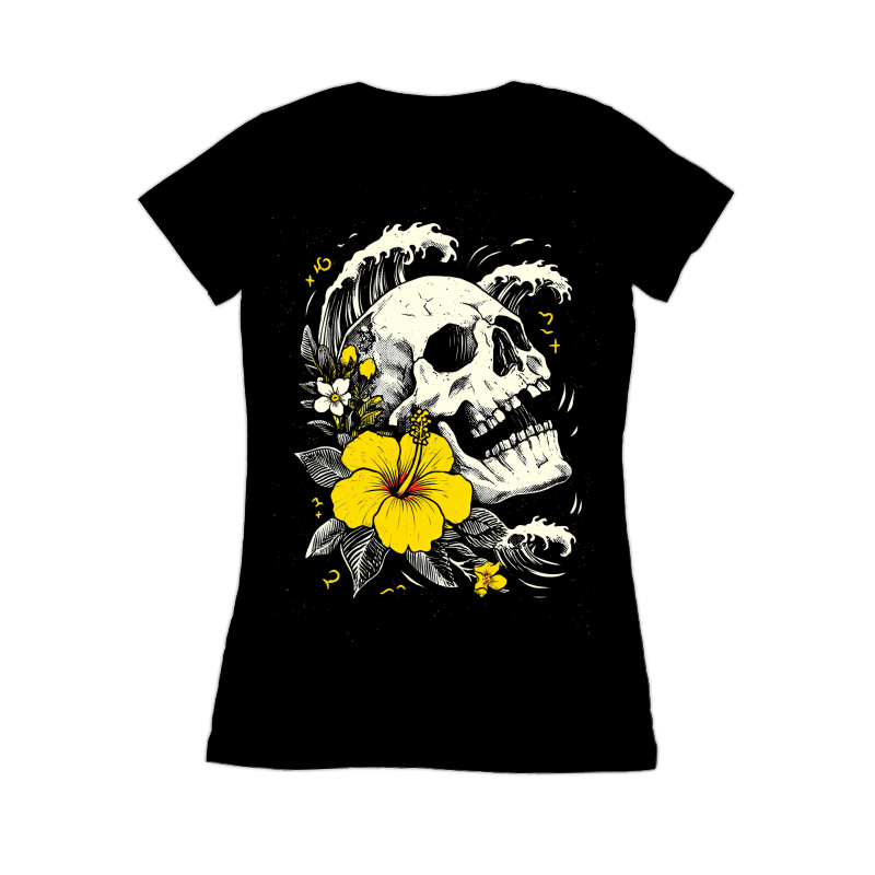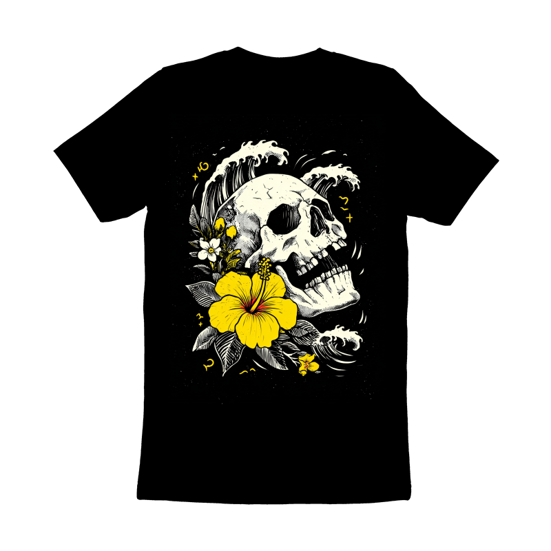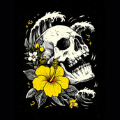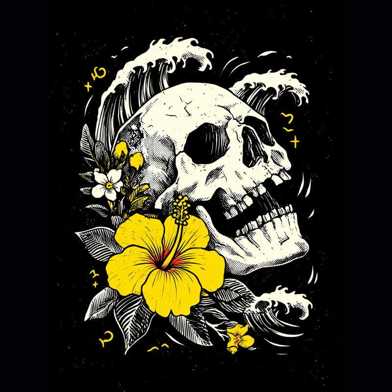 This striking design features a detailed skull as its central element, juxtaposed with the delicate beauty of hibiscus flowers and crashing waves. The skull, rendered in a vintage style with halftone shading, adds a touch of macabre elegance. Bright yellow hibiscus blooms provide a vibrant contrast to the skull's bone-white hue, creating a visually arresting composition. The waves add a dynamic, almost chaotic energy, framing the skull and flowers. The overall effect is a blend of life and death, beauty and decay, rendered in a style that evokes both classic tattoo art and vintage poster design. The black background enhances the contrast and intensifies the visual impact, making it a bold statement piece.