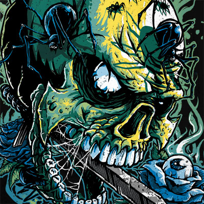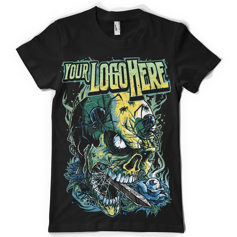 Skull and Spiders t-shirt designs featuring a scary skull roamed by creepy spiders, an eye coming out of a rose and sword blade coming ot of the skull's mouth. T-shirt file is available in PSD format only.