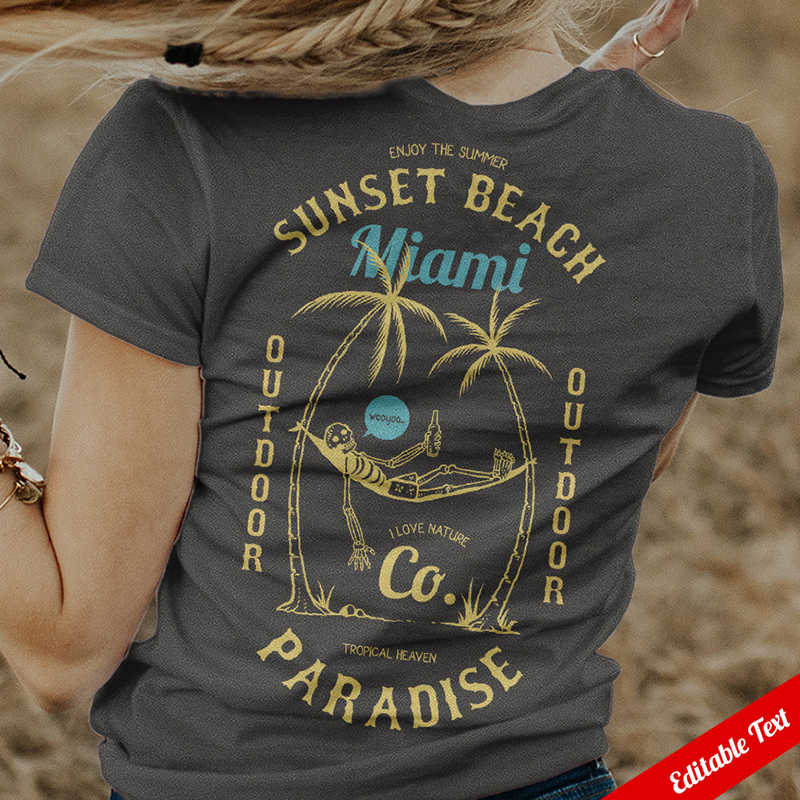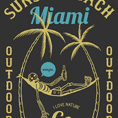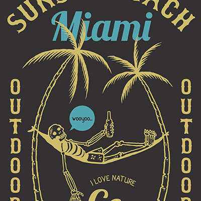 Vector illustration of skull relaxing in a beautiful island with beach and palm. Ready to print on t-shirt.