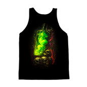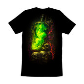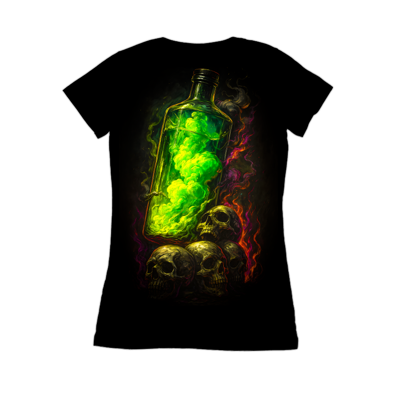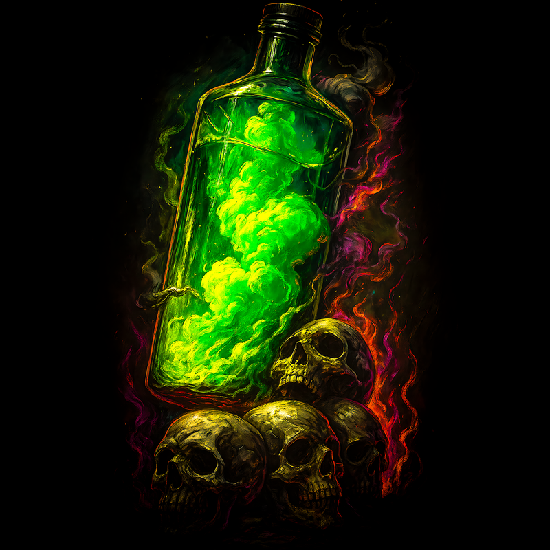 This design features a mystical blend of macabre and magic. A tall, clear bottle filled with a vibrant, glowing green liquid dominates the composition, suggesting a potent potion or elixir. The bottle casts an eerie light upon a cluster of skulls at its base, their bony surfaces rendered with detailed textures and shadows. Swirls of ethereal smoke in shades of red, orange, and purple encircle the scene, adding to the design's otherworldly atmosphere. The stark contrast between the bright potion and the dark background enhances the design's dramatic impact, making it perfect for themes related to fantasy, horror, or the occult. The overall effect is both captivating and slightly unsettling, drawing viewers into a world of dark enchantment. Designers could use this image for Halloween promotions, gothic-themed event posters, or as a striking graphic for fantasy game merchandise. Its unique aesthetic would also lend itself well to book covers, especially in the genres of dark fantasy or horror. The design's detailed rendering and vibrant colors make it suitable for both digital and print applications.