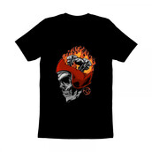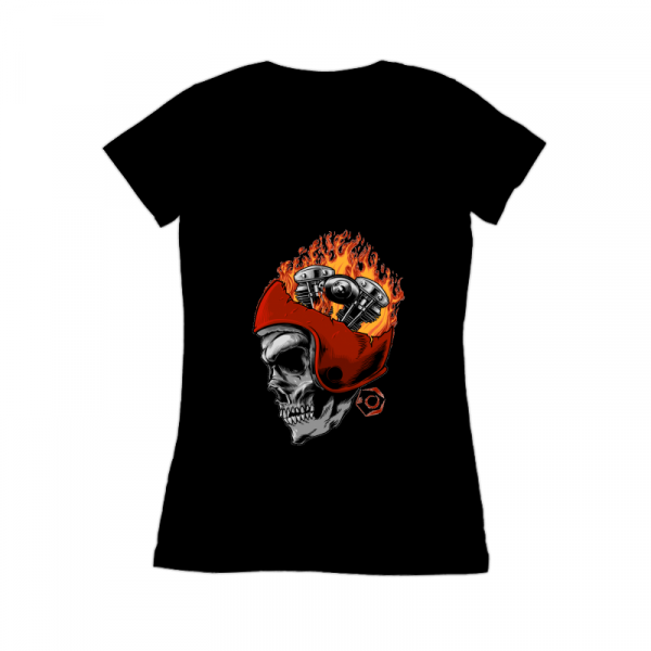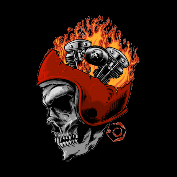 tshirt design for motorcycles club, community, and other with a skull head skeleton and motorcycles engine with a vintage hand drawn style illustration