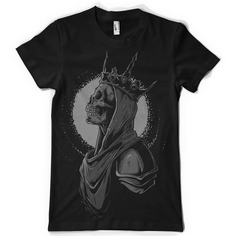 Skull King t-shirt design in vector format.The artwork is featuring a skull with armor and a crown on his head.This is an Adobe Illustrator file, ready for print. Files included are Eps. The template can be used for digital printing and screenprinting.The file is well organised with every element on its own layer, including artwork and background.