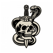 This powerful and dramatic illustration showcases a striking combination of a skull, a serpent, and a sword. The skull, with its hollow eye sockets and menacing grin, symbolizes death and mortality. It is pierced by a formidable sword, which represents strength, power, and the inevitability of conflict. Coiled around both the skull and the sword is a venomous snake, its fangs bared and tongue flicking, embodying danger, treachery, and the eternal struggle between life and death. The serpent’s scales and the intricate hilt of the sword are rendered with meticulous detail, adding depth and realism to the design. The stark contrast between the dark outlines and the pale bone of the skull creates a visually arresting image. This illustration is ideal for tattoo designs, gothic and dark art, and any creative project that delves into themes of mortality, conflict, and the interplay of life’s darker aspects. The bold and striking imagery is sure to captivate and provoke thought, making it a standout piece for any collection.