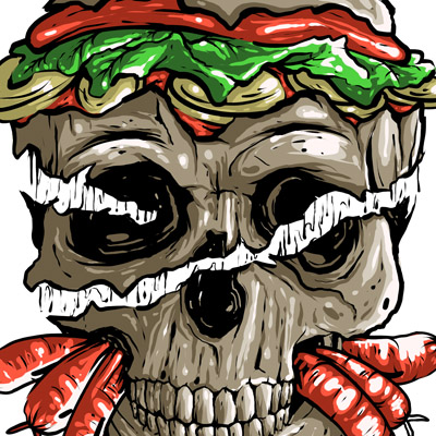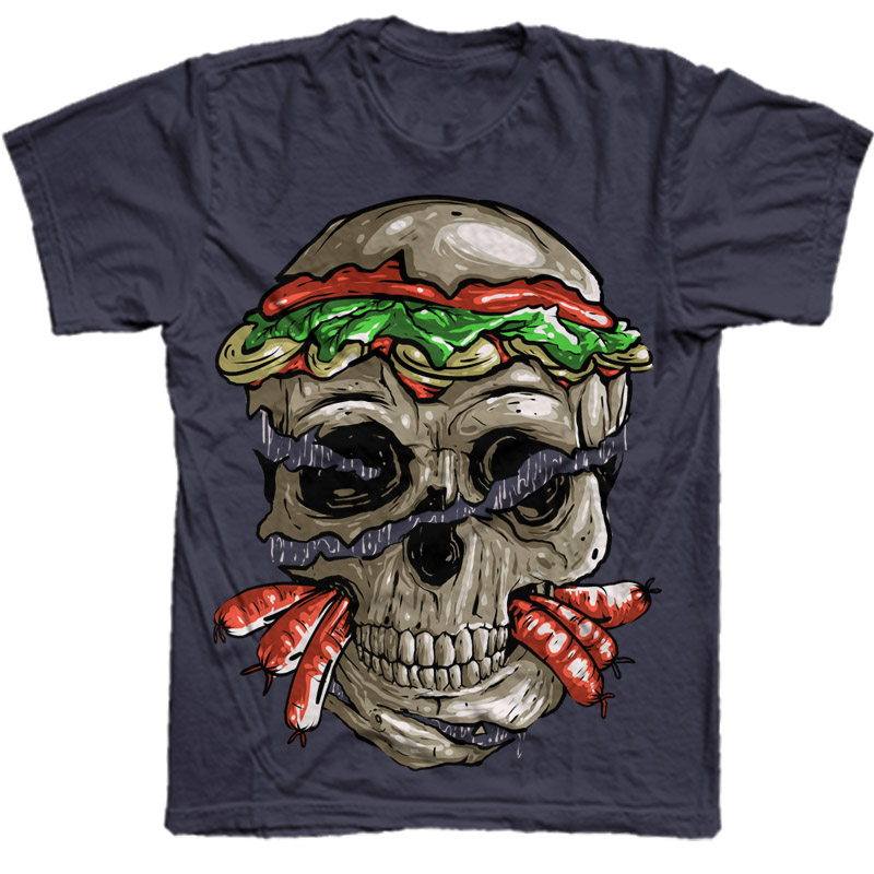 Skull yummi illustration. T-shirt design featuring a cartoon character. The file is suitable for Adobe Photoshop and can be used for digital printing and screenprinting.