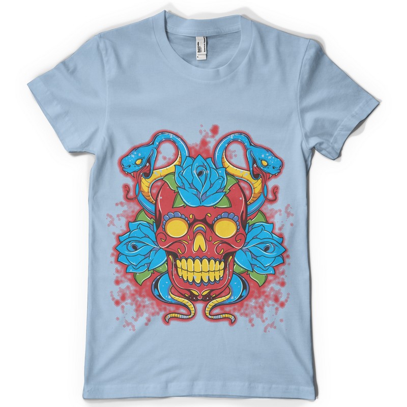 Snakes digital design template in vector format, featuring detailed flowered skull now available for Adobe Illustrator, Adobe Photoshop and Corel Draw and can be used for digital printing and screenprinting .