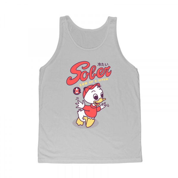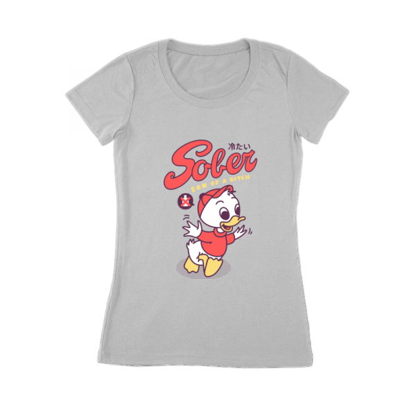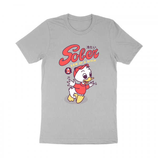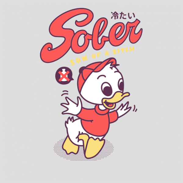 "Sober " T-shirt design featuring a cartoon style duck. The files available are suitable for Adobe Illustrator and Adobe Photoshop and can be used for digital printing and screen-printing.