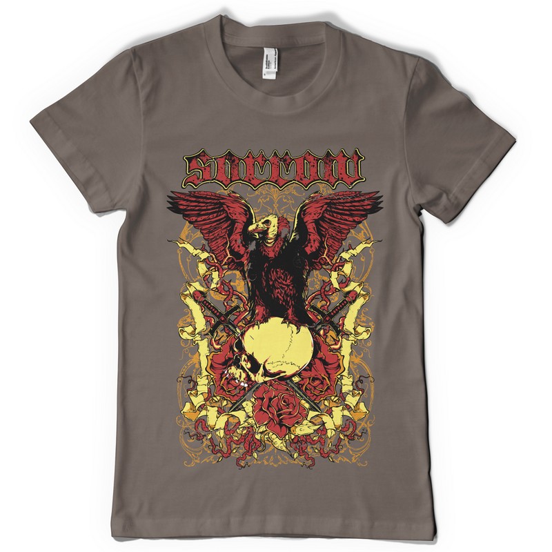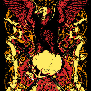 Sorrow digital design template in vector format, featuring detailed raven on top of a skull now available for Adobe Illustrator, Adobe Photoshop and Corel Draw and can be used for digital printing and screenprinting .