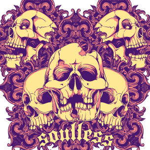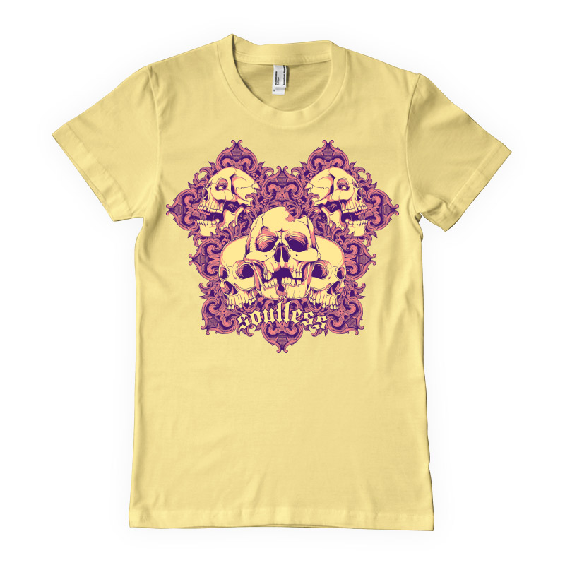 Soulless graphic template in vector format, featuring detailed flourish skulls now available for Adobe Illustrator, Adobe Photoshop and Corel Draw and can be used for digital printing and screenprinting .