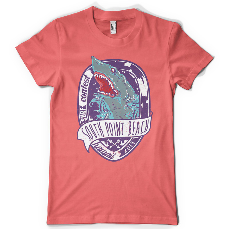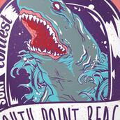 South Point Beach graphic design template in vector format, featuring detailed creepy angry shark now available for Adobe Illustrator, Adobe Photoshop and Corel Draw and can be used for digital printing and screenprinting .