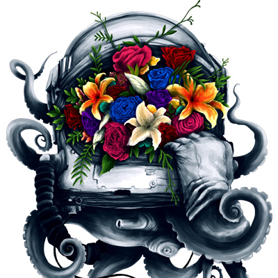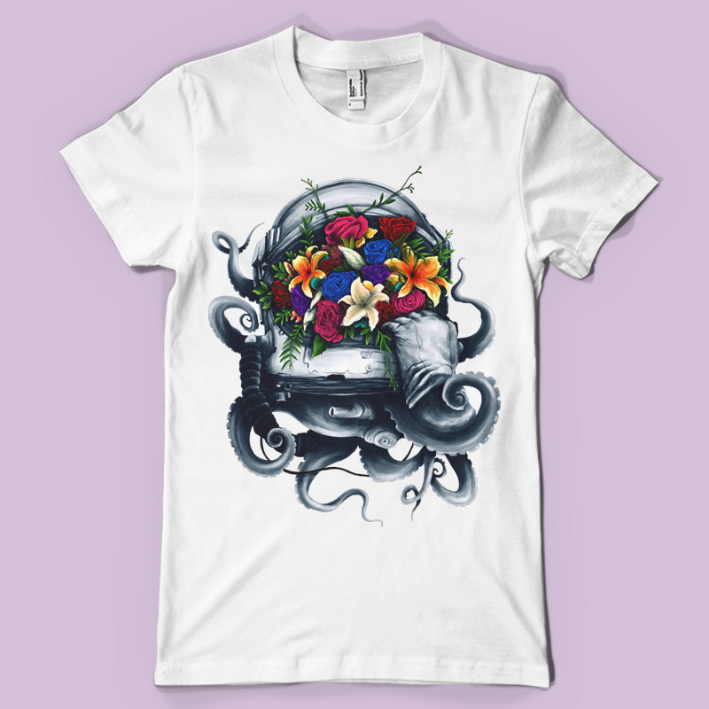 "Space Bloom" is a unique illustration of an astronaut with different flowers coming out of its helmet with an octopus crawling below it. This design is very unique because of its colors and style. A mixture of space, nature and animals! File contains a 17x24 in size with 300 in dpi.