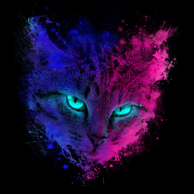 "Space Gaze" is a unique illustration of a Cat mixed with grunge and space effects using neon blue, pink and teal colors to make it pop on any product. File contains a PSD file with 17x24 in size.