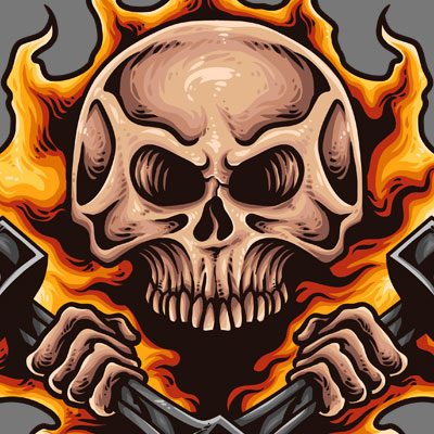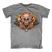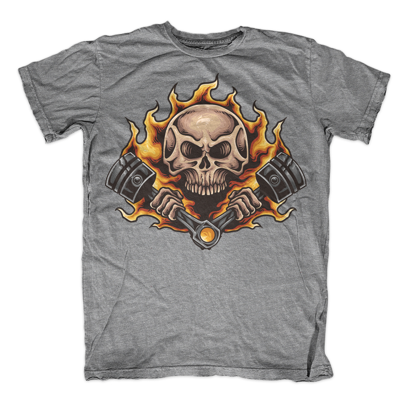 Vector illustration of skull, piston engine and flames in a vintage tattoo style. Ready to print on t-shirt.