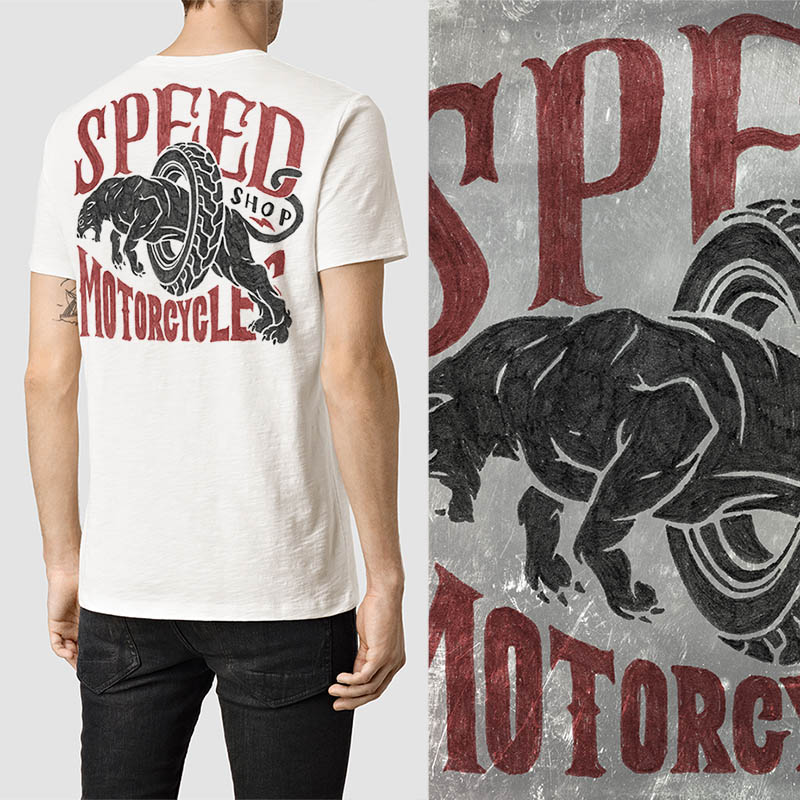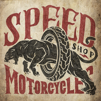 * Speed Shop * is part of my Vintage Series designs, a collection of handmade classic imagery, scanned at the highest resolution. Being handdraw gives it an unique texture. It comes on a PSD file, colors are separated in layers, ready to print. It can also be autotraced in Illustrator with optimal results.