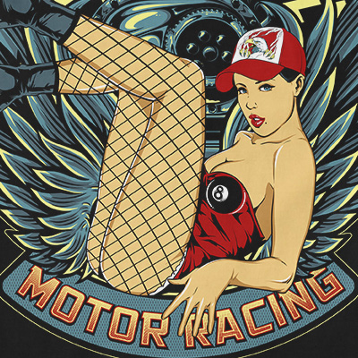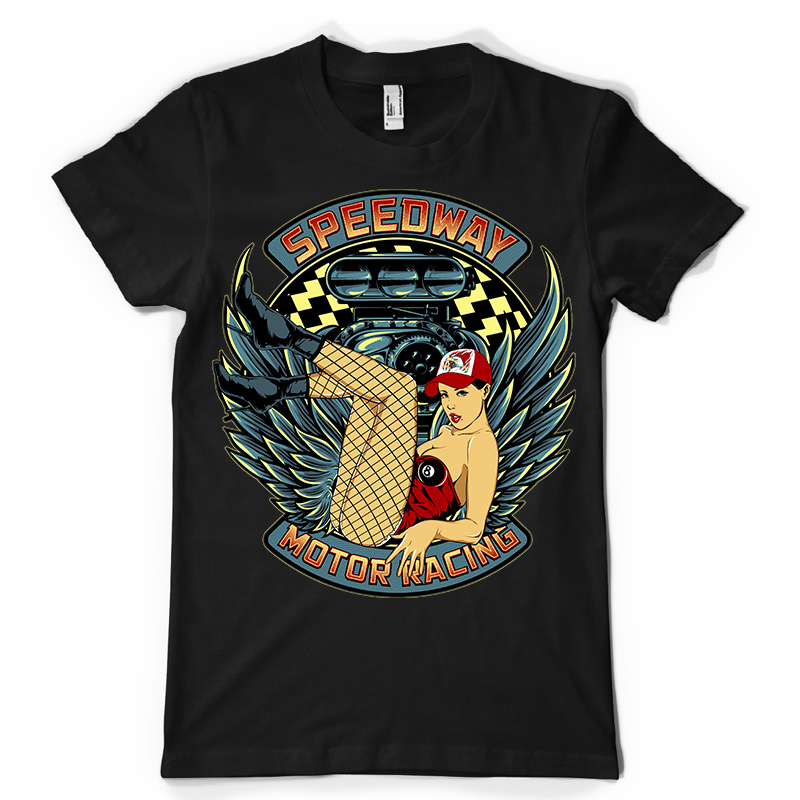 Speedaway Motor Racing design features a pin up motor detailed screen print now available for Adobe Illustrator and Corel Draw and can be used for digital printing and screenprinting.