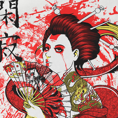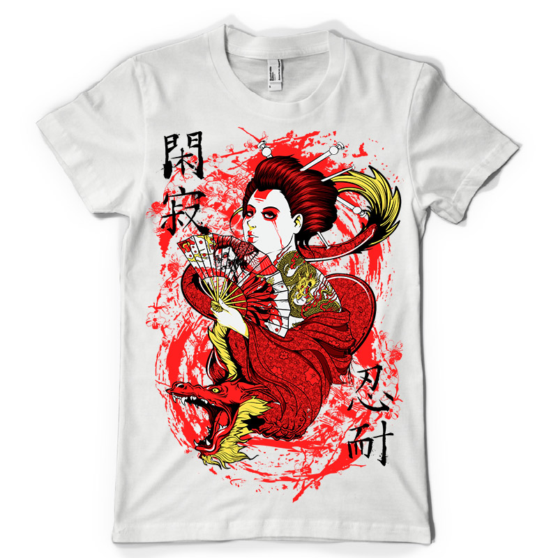 Spirit of Dragons in Adversity design features a geisha detailed screen print now available for Adobe Illustrator, and Corel Draw and can be used for digital printing and screenprinting.