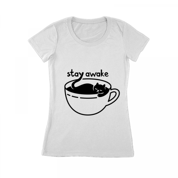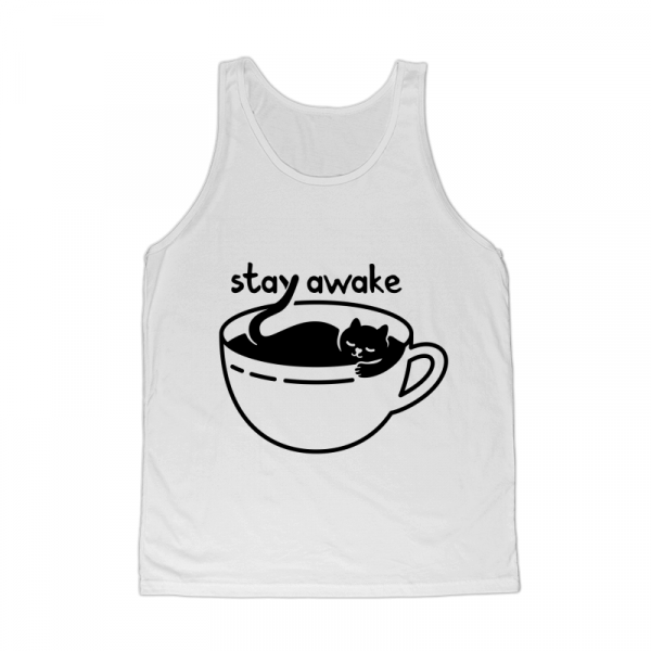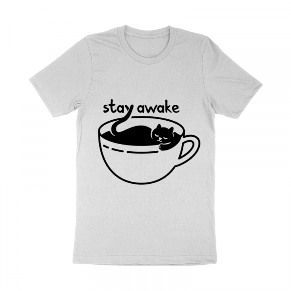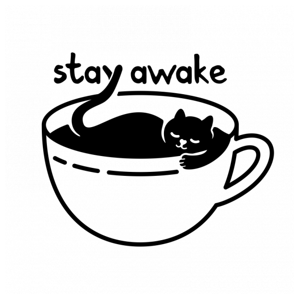 Stay Awake Coffee Cat is a monoline illustration that is suitable for apparel or merchandise about drink, food, beverage, coffee, caffeine, cafe, espresso, barista, cappuccino, cat, animal, kitten, kitty, funny, meme.