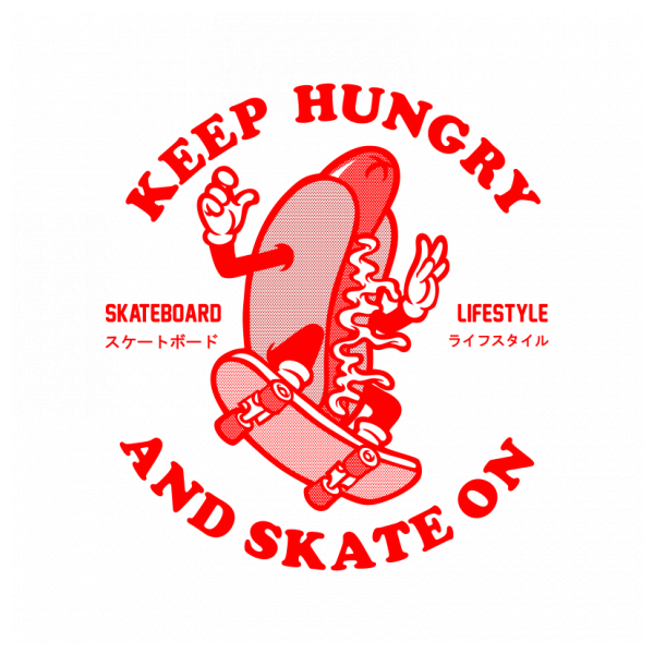 The title of Stay Hungry and Skate On , EPS and PNG files, cartoon character design is very cool for street wear style. suitable for children or teenagers. Ready to print, easy to change color.Enjoy