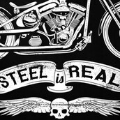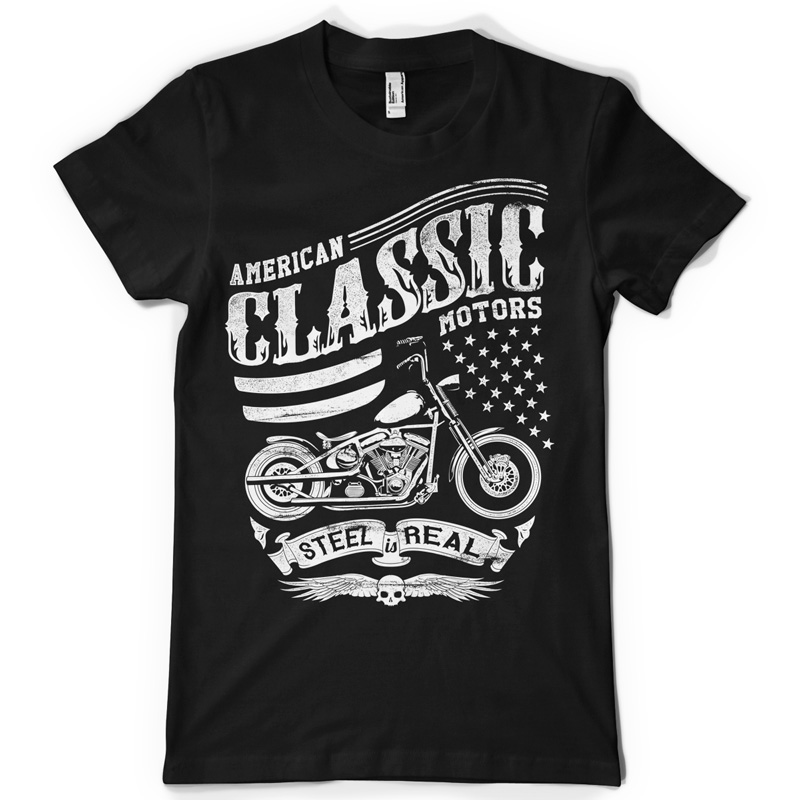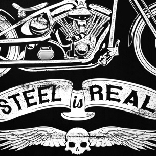 Steel is real graphic design template in vector format, featuring detailed vintage flag and motorbike now available for Adobe Illustrator, Adobe Photoshop and Corel Draw and can be used for digital printing and screenprinting .