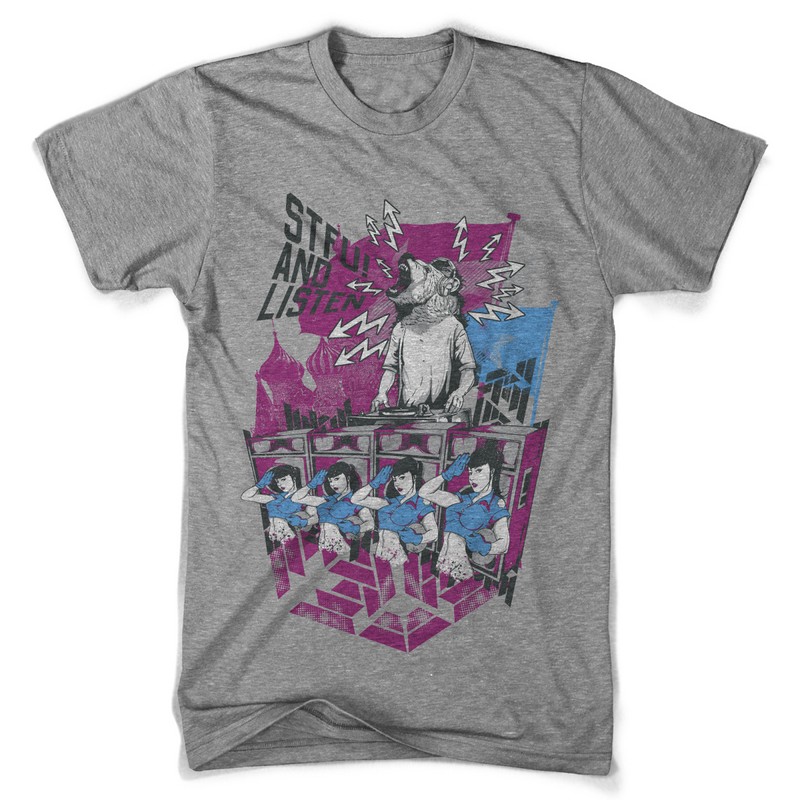 STFU and listen design template in vector format, featuring detailed funky bear dj and sexy girls now available for Adobe Illustrator, Adobe Photoshop and Corel Draw and can be used for digital printing and screenprinting .