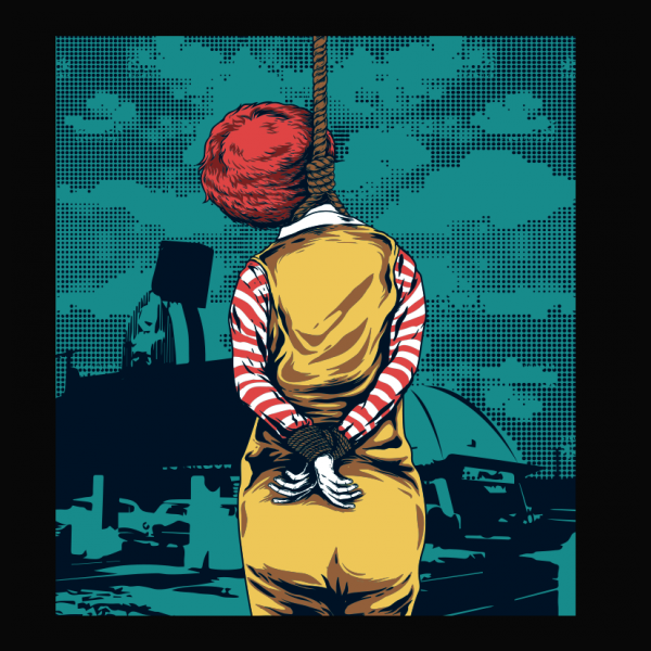 SUICIDE RONALD illustration artwork,7 color include . Separated color by layer. This design is suitable for all colours of shirts . Format AI,EPS, file.