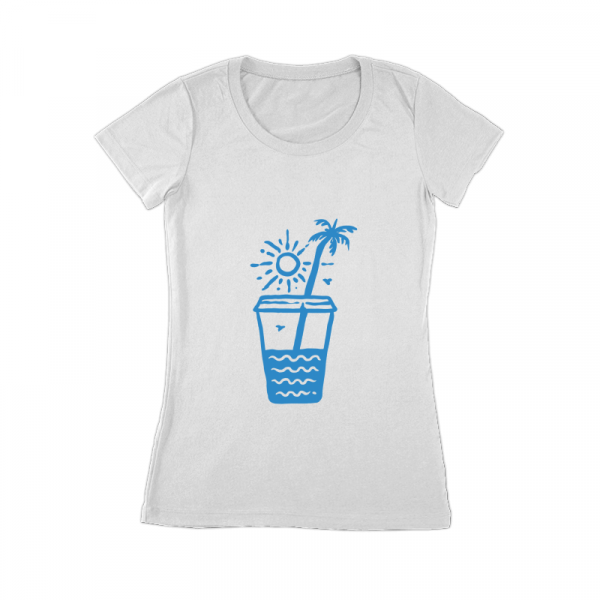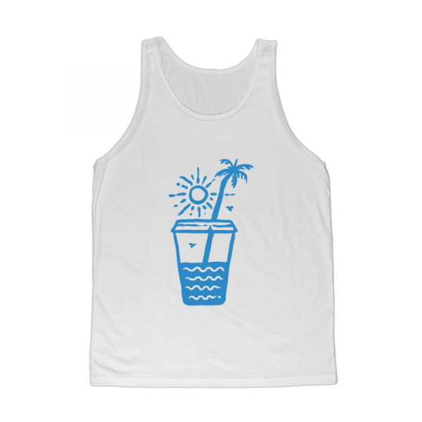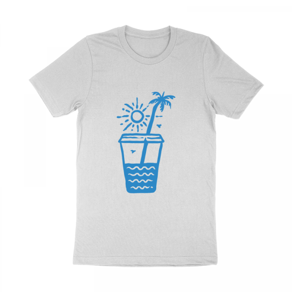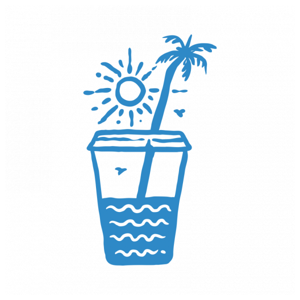 Sunset on a Coffee Cup is a monoline illustration that is suitable for apparel or merchandise about summer, vacation, holiday, travel, beach, surfing, surfboard, tropical, sea, adventure, trip, california, coffee, caffeine, drink.