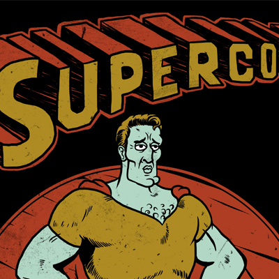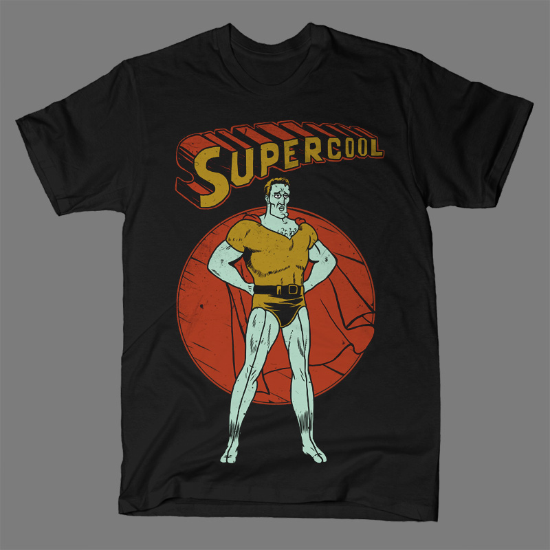 Supercool is t-shirt design that parody from Superman and squidward from spongebob. this file is psd eps. with 5 color separated layer. good for print on black t-shirt.